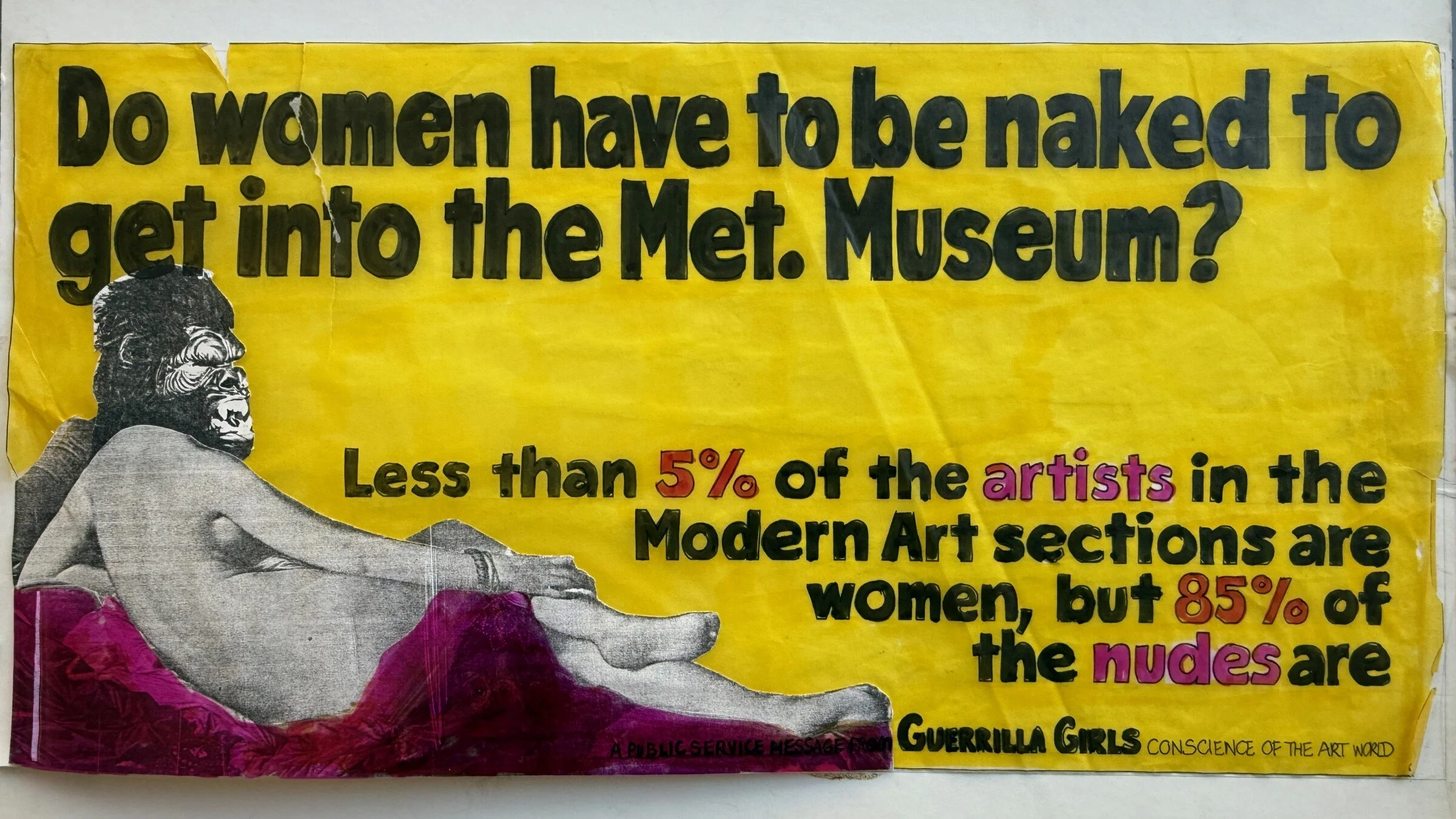 How to Be a Guerrilla Girl presents the inner workings of the anonymous feminist art collective alongside a new commission at the Getty Research Institute. Drawing on the Guerrilla Girls’ archive, the exhibition explores the steps the group took to create their eye-catching and humorous public interventions. The exhibition places the Guerrilla Girls’ well-known posters in the broader context of their data research, protest actions, culture jamming, and distribution methods. Coinciding with the Guerrilla Girls’ 40th anniversary, the exhibition tells the story of their collaborative process and longstanding commitment to call for equity for women and artists of color in the art world.